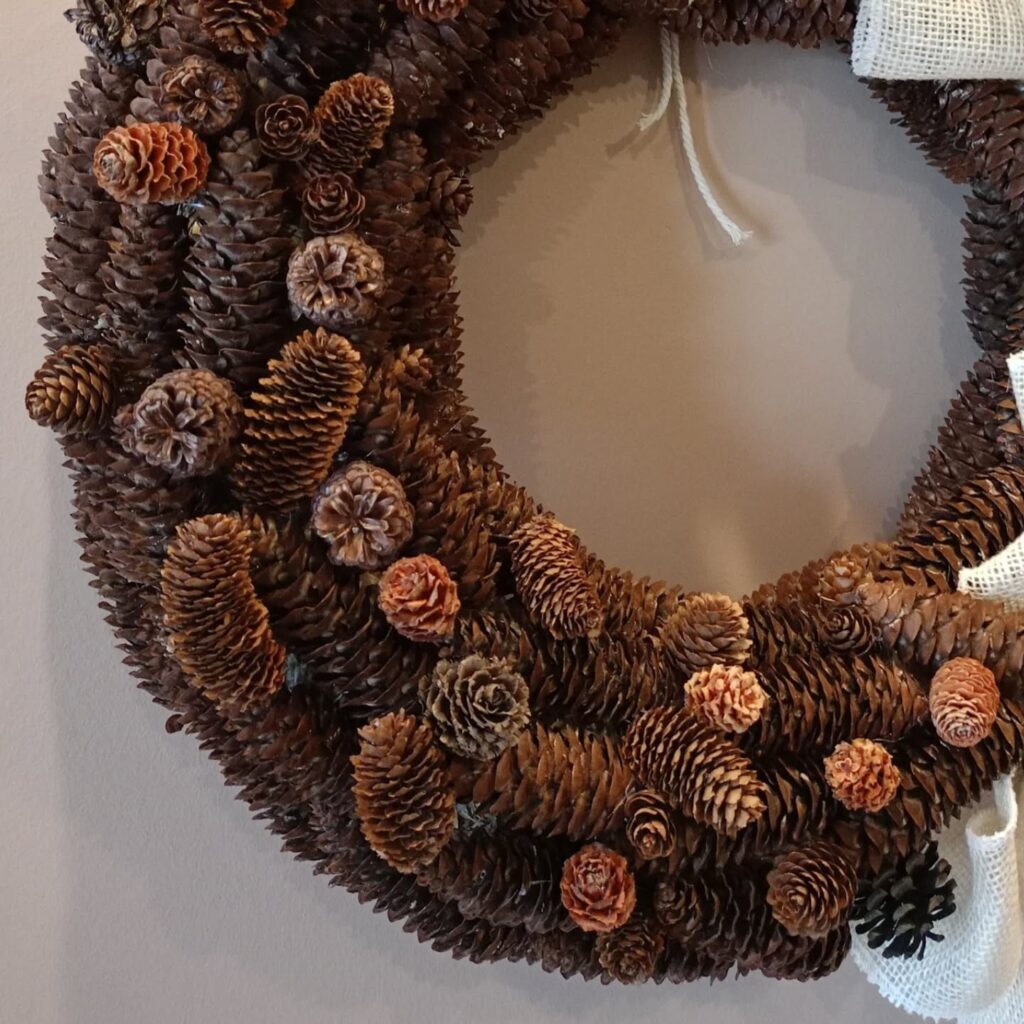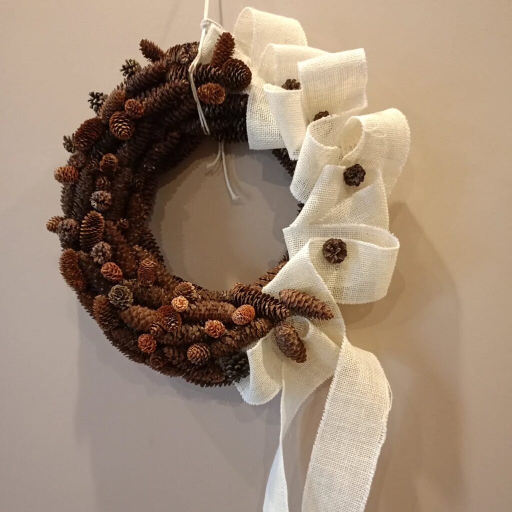Świąteczny Wieniec Świąteczny wieniec zrobiony z szyszek, oraz udekorowany falbaną 💕 ✅ Cena – 50zł ✅ Kod produktu: 139