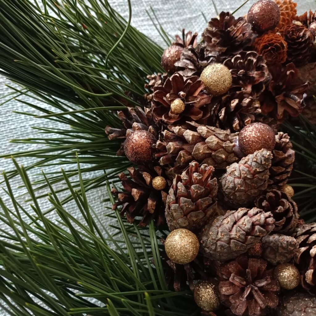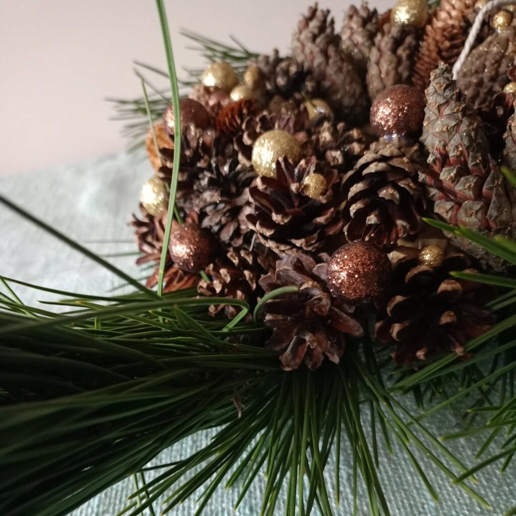 Wianek świąteczny zrobiony z szyszek z złotymi dodatkami, idealny do wystroju wnętrz jak i na zewnątrz domku jako świąteczna dekoracja 💕⭐